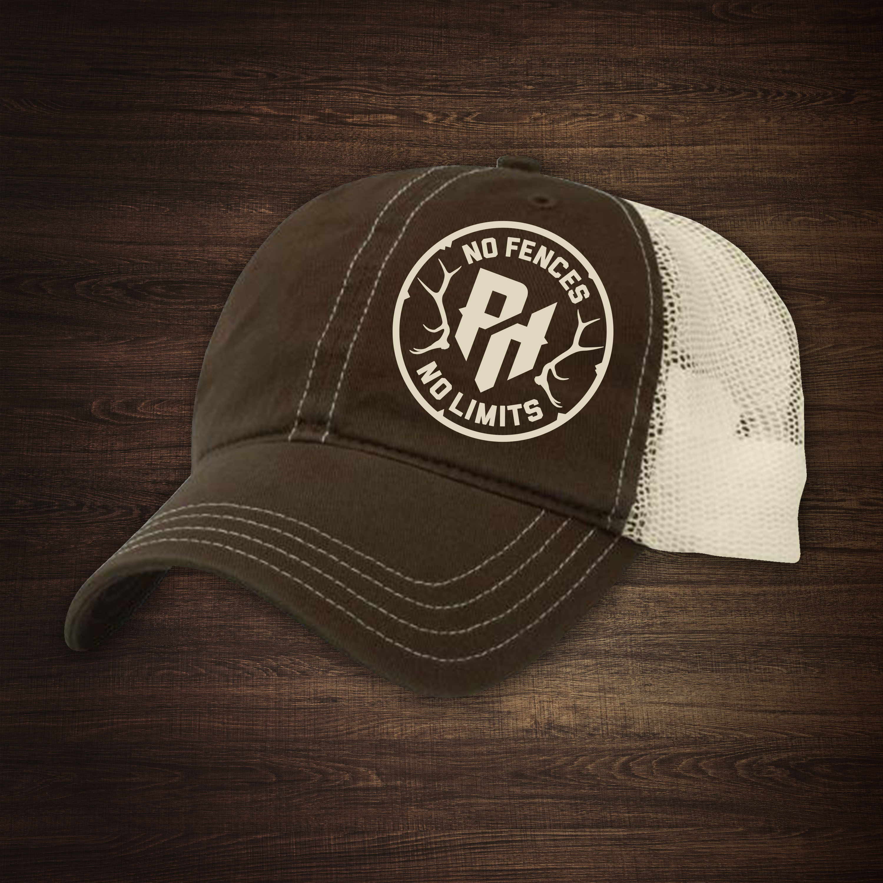 Pure Hunting "No Fences, No Limits" Hat. Richardson style 111 hat with brown front, tan mesh back and snap back.