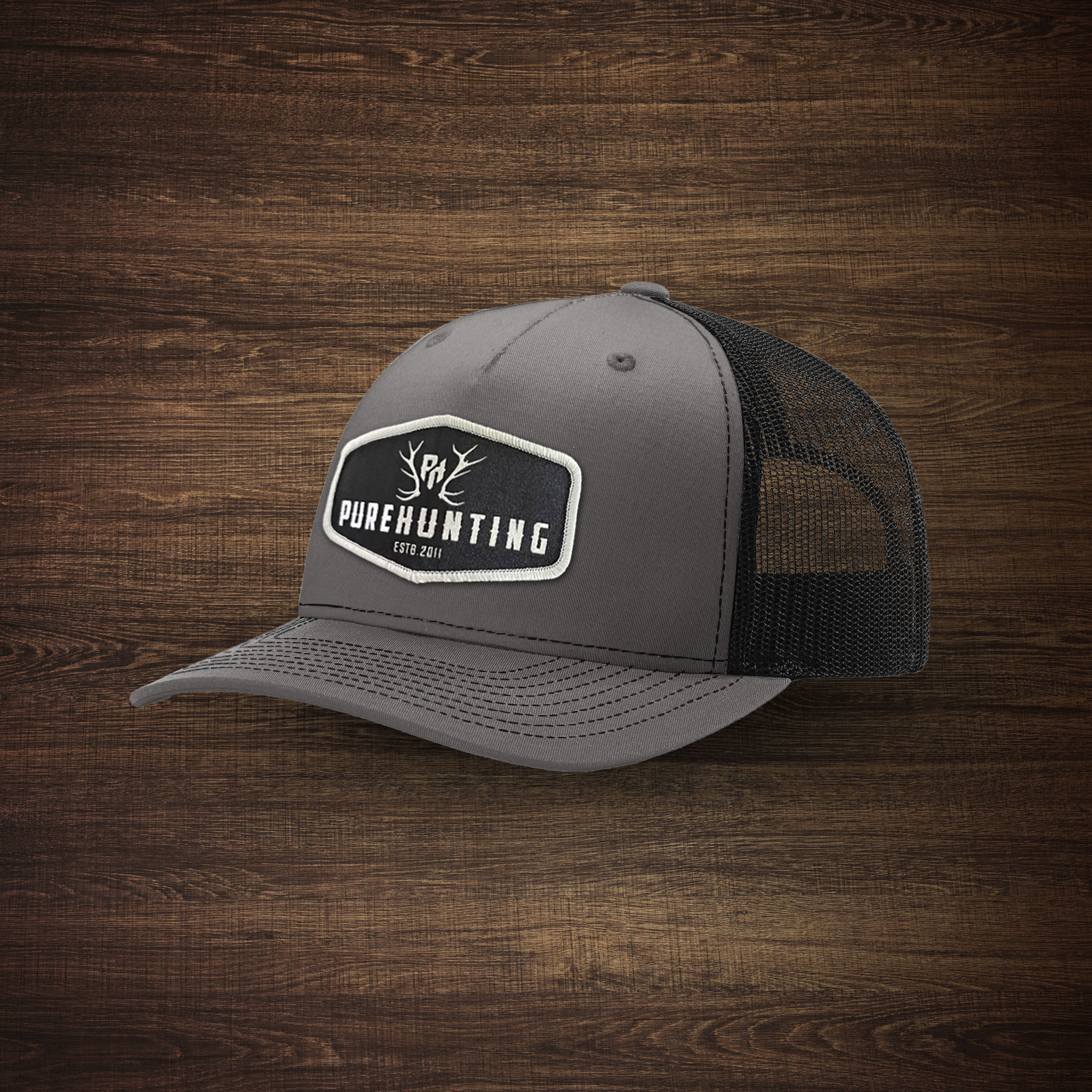 Charcoal front with black mesh backing, adjustable with "Pure Hunting, est 2011" patch on the front with logo and antlers. One size fits most.