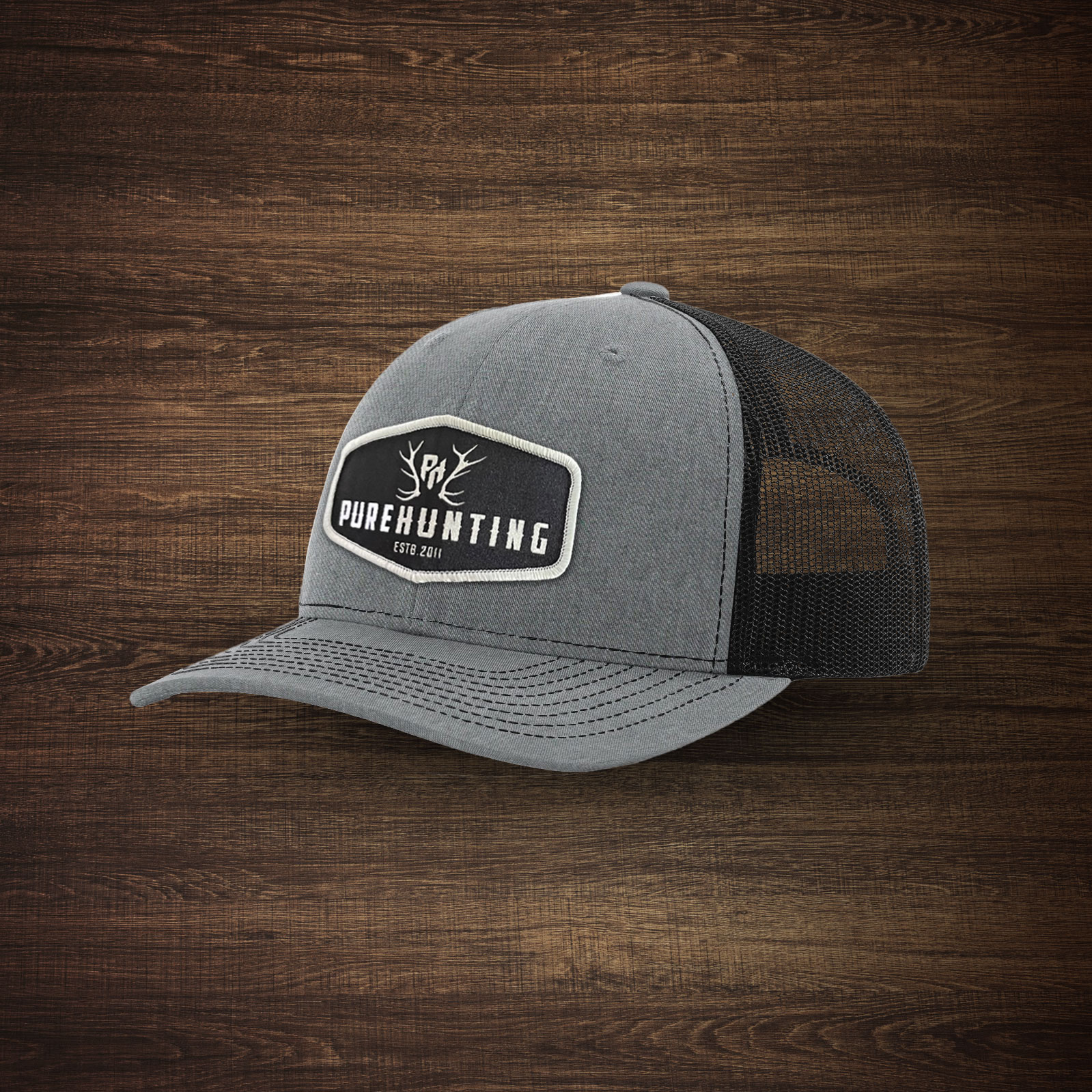 Heather front with black mesh backing, adjustable with "Pure Hunting, est 2011" patch on the front with logo and antlers. One size fits most.