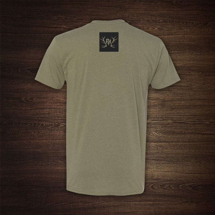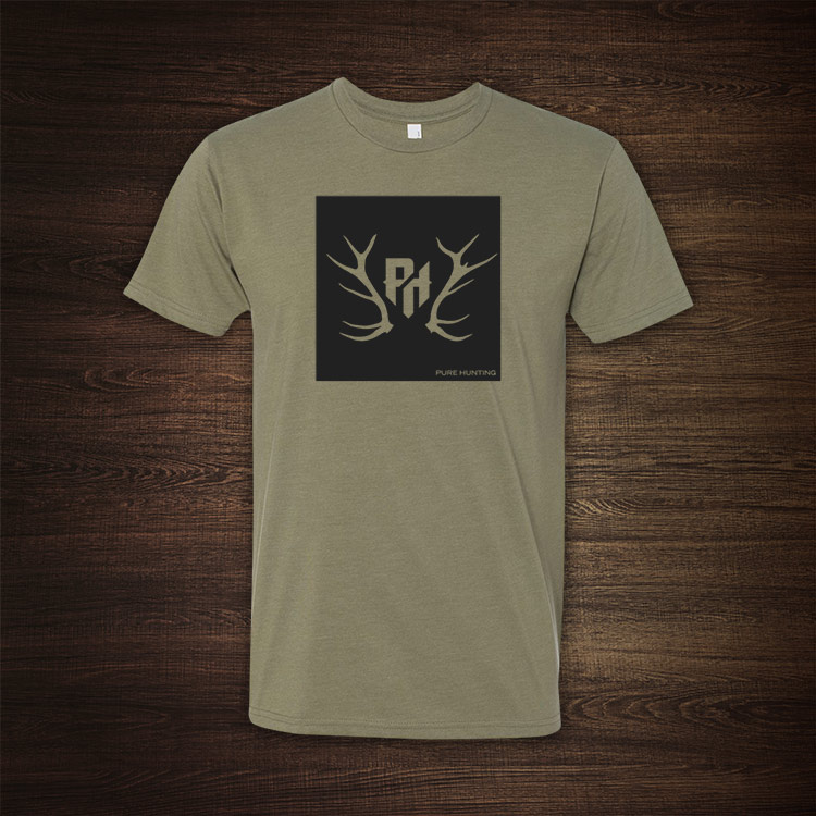 Pure Hunting with antler logo with black square T-Shirt. Olive Green color. Shirts are "Next Level" brand, 60% cotton/40% polyester. "PH" with elk antler logo in black on the front and the same smaller logo on the back below the neck.