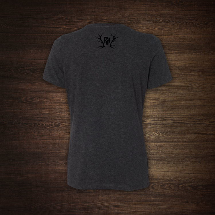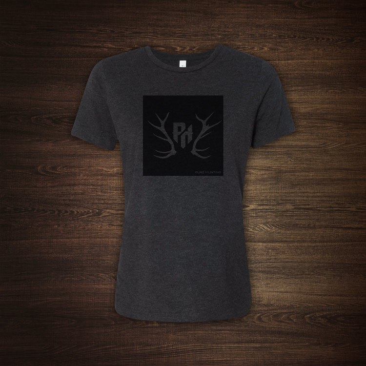 Women's Pure Hunting logo T-Shirt. Charcoal Color. Shirts are "Bella + Canvas Triblend Collection" brand and are super comfortable. 50% polyester/25% cotton/25% rayon. "PH" with antler logo inset in a black square on the front and the same, smaller "PH" with elk antlers on the rear below the neck.