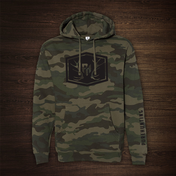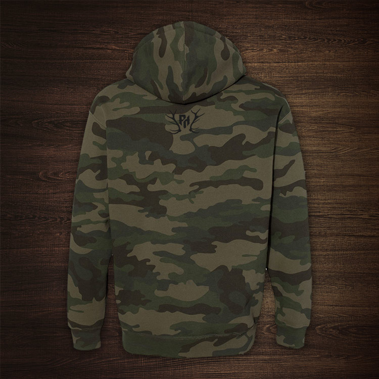 Pure Hunting Long Sleeved Hoodie with draw string. These are in an Olive camo pattern and are a brand new addition to the apparel line. They are 80% cotton and 20% polyester giving a little stretch. They have a large front pocket with an opening on the left and the right. The front has a larger "PH" with elk antler logo inside a black, oblong hexagon shape. The back features a smaller "PH" with elk antler logo just below the neck.